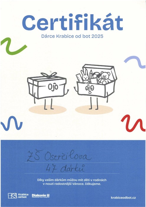 Krabice od bot je charitativní sbírka organizovaná Diakonii ČCE, do které se naše škola každoročně zapojuje. I letos v předvánočním čase ukázali naši žáci a učitelé velkou ochotu pomáhat a že charita a pomoc druhým jsou pro nás důležitá témata a přináší radost všem - nejen obdarovaným, ale i dárcům. Naši žáci připravili a zabalili neuvěřitelných 45 dárků pro děti, ke kterým by letos Ježíšek z nejrůznějších důvodů netrefil. Vedení školy se připojila dárky pro maminku a pro tatínka. V pátek 5. prosince jsme za pomocí našich žáků naložili dvě plná auta a dárky zavezli organizátorům.