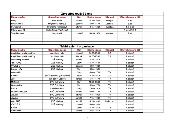 | Školní časopis | Mrtýnková | pondělí | 14:45 - 15:30 | učebna | 2. st. |